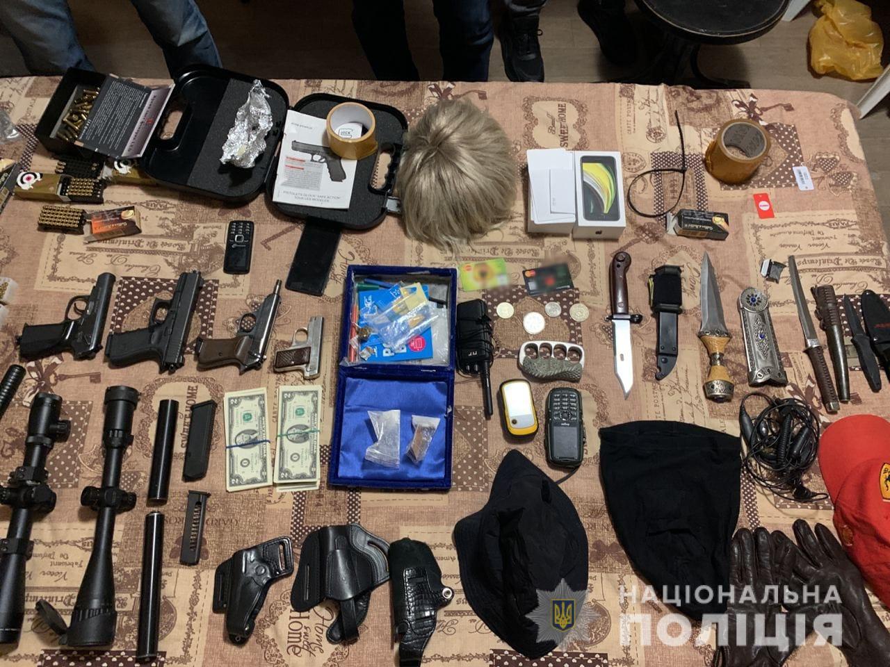 Під час обшуків в їхніх будинках працівники поліції знайшли велику кількість зброї різної модифікації, боєприпаси, кастети, ножі, балаклави, рації, перуки, рукавички, мобільні телефони, банківські картки, наркотики і гроші. Також вилучено автомобілі, на яких пересувалися злодії.