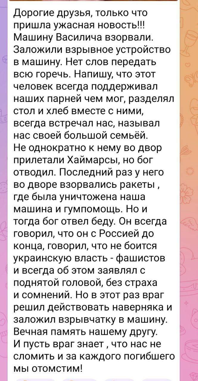Зазначається, що машина була припаркована біля кафе "Гетьман", власником якого він був, де збирались офіцери ФСБ та колаборанти. Разом з ним в Жигулі сіли ще чоловік та жінка.