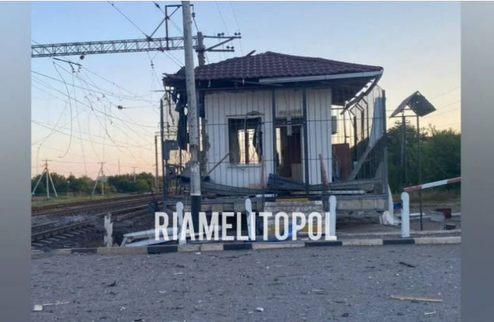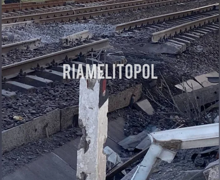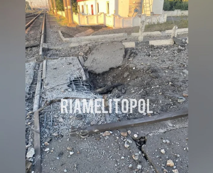 Місцеві жителі зранку зробили фото місця "прильотів" - у районі переїзду на станції у Новобогданівці Мелітопольського району розбито залізничне полотно. Крім того, пошкоджено також будівлю переїзного посту.