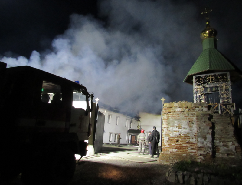 Вогонь охопив дах будівлі. З ним борються кілька десятків рятувальників з чотирьох районів. Врятовано частину монастирського майна.