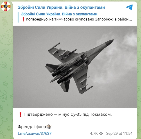 "Підтверджено - мінус Су-35 під Токмаком. Френдлі фаєр", - йдеться у повідомленні.
