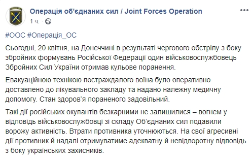 У понеділок, 20 квітня, бойовики обстріляли позиції ЗСУ в Донецькій області, поранений український боєць.