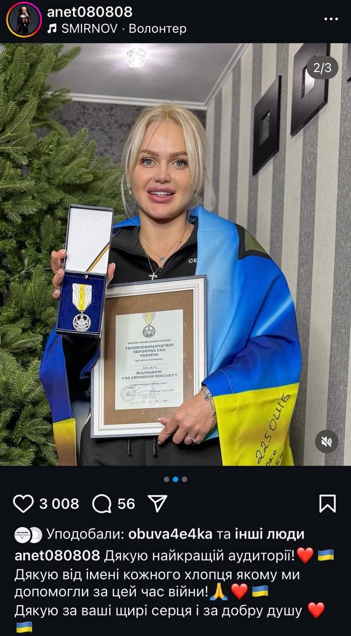 Блогерка мала відзнаку "За сприяння війську" від головнокомандувача ЗСУ.
