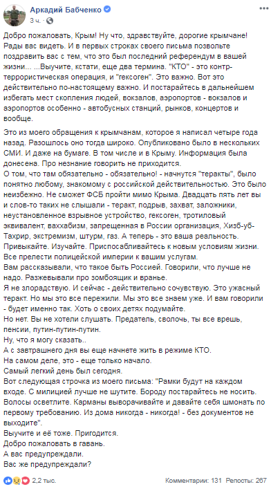 "Ласкаво просимо, Крим! Ну що, здрастуйте, дорогі кримчани! Ради вас бачити. І в перших рядках свого листа дозвольте привітати вас з тим, що це був останній референдум у вашому житті ... ... Вивчіть, до речі, ще два терміна. "КТО" - це контр-терористична операція, і "гексоген". це важливо. Ось це дійсно по-справжньому важливо. І постарайтеся надалі уникати місць скупчення людей, вокзалів, аеропортів - вокзалів і аеропортів особливо - автобусних станцій, ринків, концертів і взагалі", - відповідне послання Бабкін написав чотири роки тому.