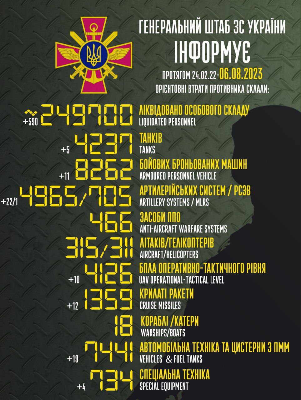 ЗС РФ впродовж минулої доби втратили 590 бійців, а загальні втрати серед особового складу від початку повномасштабного вторгнення 249,7 тис. осіб.