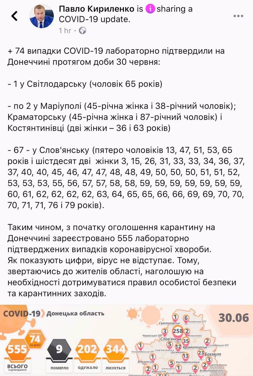 Так, в сьогоднішньому зведенні МОЗ кажуть, що в Донецькій області 484 інфікованих. А ось місцева влада повідомляє, що 555", - йдеться в повідомленні.