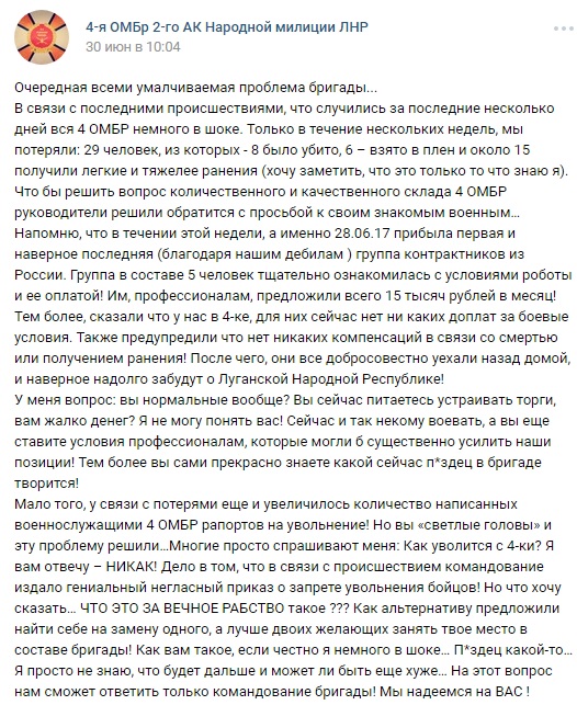 Також наголошується, що 28 червня в бригаду бойовиків прибула перша група контрактників з Росії у складі п'яти осіб. Однак, ознайомившись з умовами відплати (15 тисяч рублів на місяць і відсутність будь-яких доплат), росіяни повернулися назад в РФ. Також відмітається, що керівництво 4-ї ОМБр бойовиків "ЛНР" заборонив звільнятися з підрозділу.