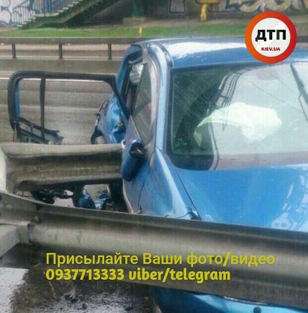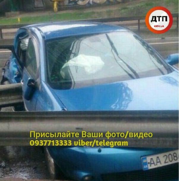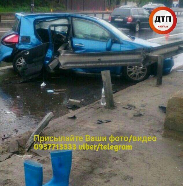 "Відео моменту аварії з потерпілими в Києві на Теліги: синій Renault Megan швидко випередив справа нашого читача, який їхав 70 км/годину, через 20 сек біля містка вилетів у відбійник ... Стрічка прошила задню частину авто, де сиділа дівчина-пасажир. Свідки поспішили на допомогу", - зазначають журналісти.