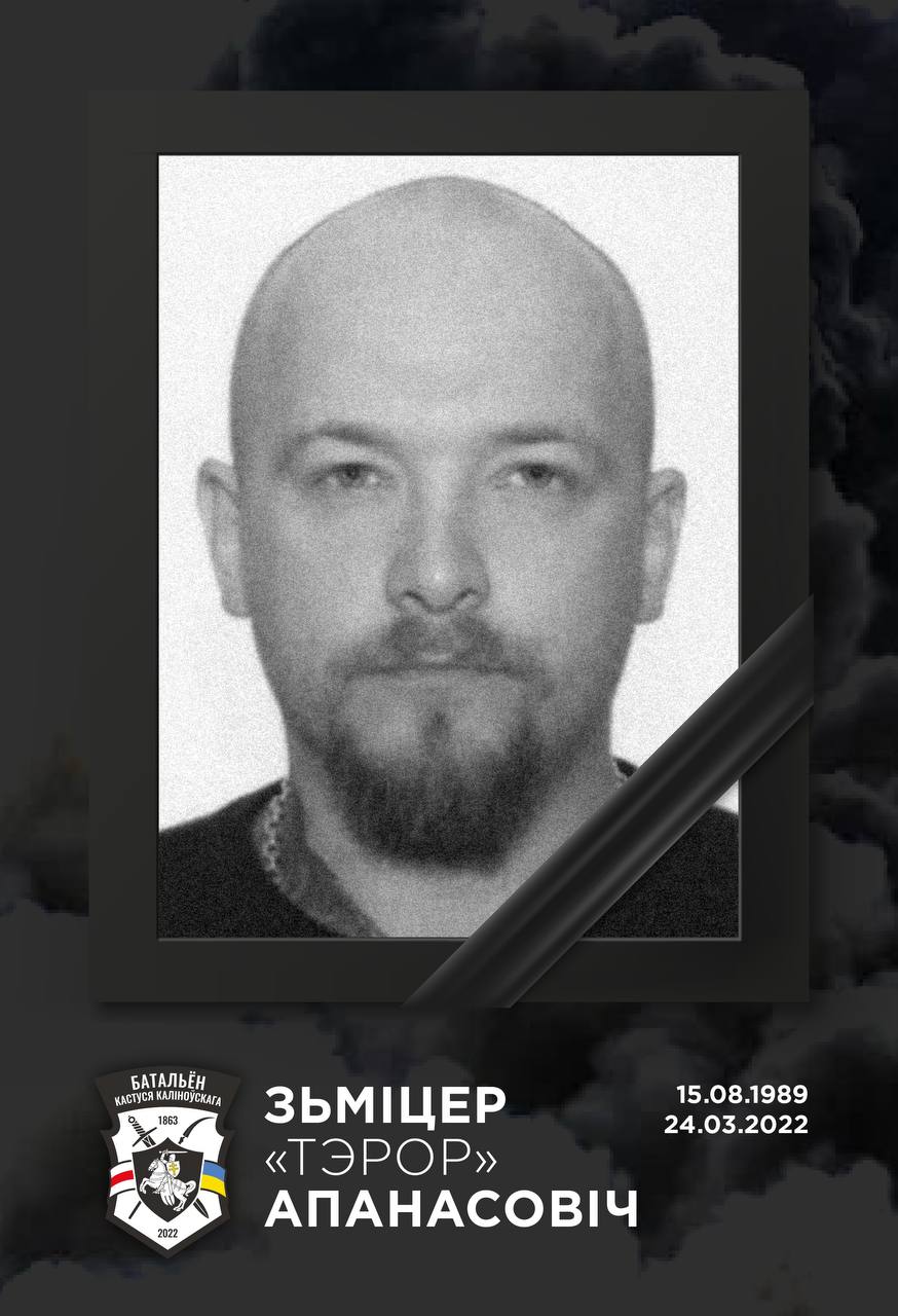 "Під Ірпенем Київської області в ході боїв з військами РФ загинув член білоруського добровольчого батальйону імені Кастуся Каліновського Дмитро "Терор" Апанасович" , - йдеться у повідомленні.