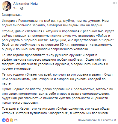 Історія з Росляковим, на мій погляд, є глибшою, ніж ми думаємо. Нам піднесли велике дзеркало, в якому нас видно, як на долоні. Країна, давно злетіла з котушок і порвала з реальністю, буде зараз проводити посмертну психіатричну експертизу вбивці і міркувати про "нормальності". Медицина, чиє уявлення про "норму" береться з підручників з психіатрії 50-х рр, претендує на експертну оцінку з розумінням проблем сучасної людини", - написав російський блогер Alexander Hotz.