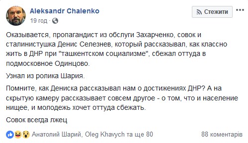 "Виявляється, пропагандист з обслуги Захарченко, совок і сталіністушка Денис Селезньов, який розповідав, як класно жити в ДНР при "ташкентському соціалізмі", втік звідти в підмосковне Одінцово", - написав Чаленко, зазначивши, що дізнався про це з відео іншого пропагандиста, який також втік з України, Анатолія Шарія.