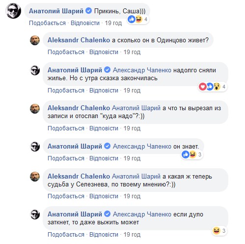 У коментарях під постом Чаленко запитав у Шарія, яка ж доля тепер чекає Селезньова, на що той відповів "якщо дуло заткне, то навіть вижити може".