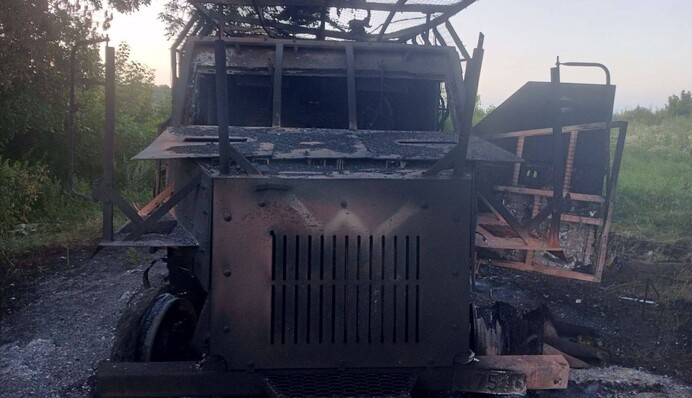 Військова техніка була "модифікована російськими добровольцями" перед тим, як її "було відправлено до України і остаточно втрачено там", пише OSINT-дослідник. За наявною інформацією, росіяни наварили на машину додаткову броню, однак це не вберегло її від знищення.