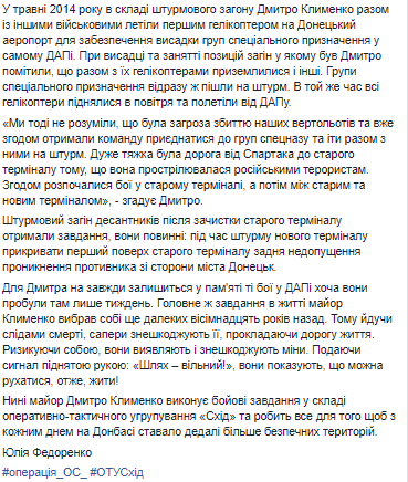 "Ми тоді не розуміли, що була загроза збиттю наших вертольотів та вже згодом отримали команду приєднатися до груп спецназу та іти разом з ними на штурм. Дуже тяжка була дорога від Спартака до старого терміналу тому, що вона прострілювалася російськими терористам. Згодом розпочалися бої у старому терміналі, а потім між старим та новим терміналом", - згадує Дмитро.