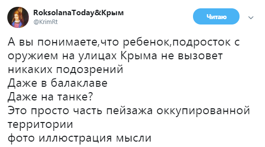 "А ви розумієте, що дитина, підліток зі зброєю на вулицях Криму не викличе ніяких підозр. Навіть в Балаклаві. Навіть на танку? Це просто частина пейзажу окупованої території. Фото ілюстрація думки", - написала блогер.