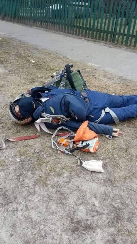 На знімку видно закривавлене тіло російського льотчика, яке лежить на землі в одному з українських населених пунктів. Повідомляється, що він був збитий. Після катапультування його парашут не розкрився, через що він упав на повному прискоренні з великої висоти.