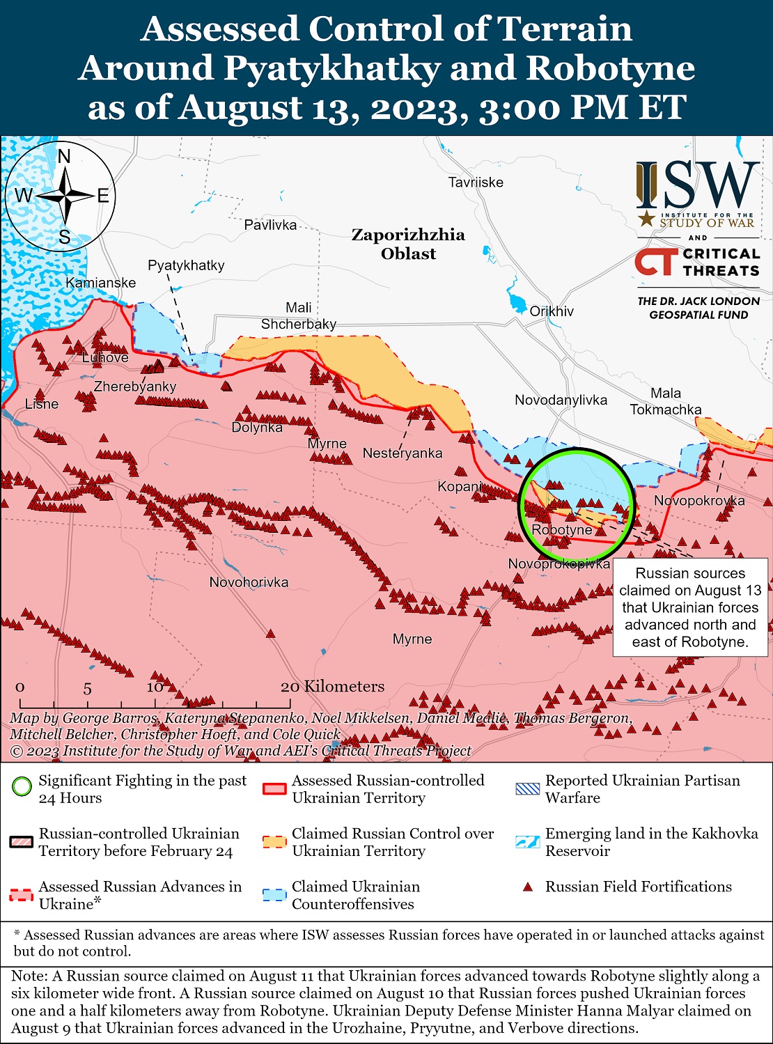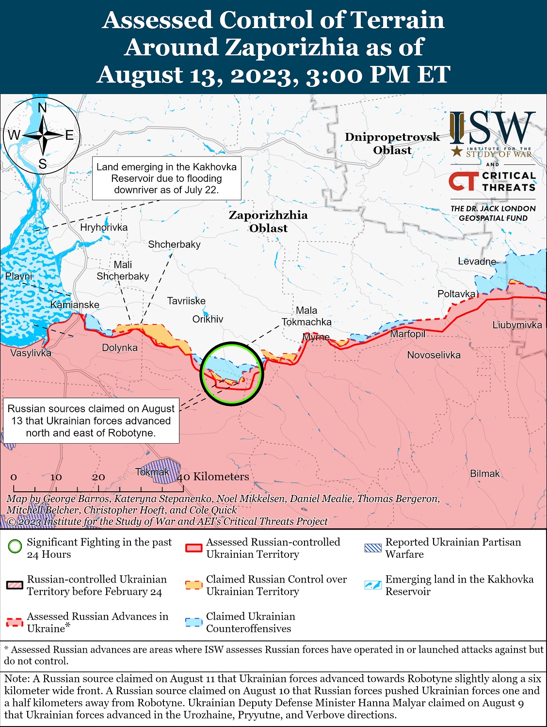 Росіяни стверджують, що дві штурмові групи ЗСУ загальною чисельністю від 40 до 60 осіб завдали удару по російським позиціям в районі Роботиного (13 км на південь від Оріхова) і захопили кілька позицій за 3 км на схід і північний захід від Роботиного. Повідомляється, що 13 серпня війська РФ провели безуспішні спроби повернути втрачені позиції на схід від Роботиного.