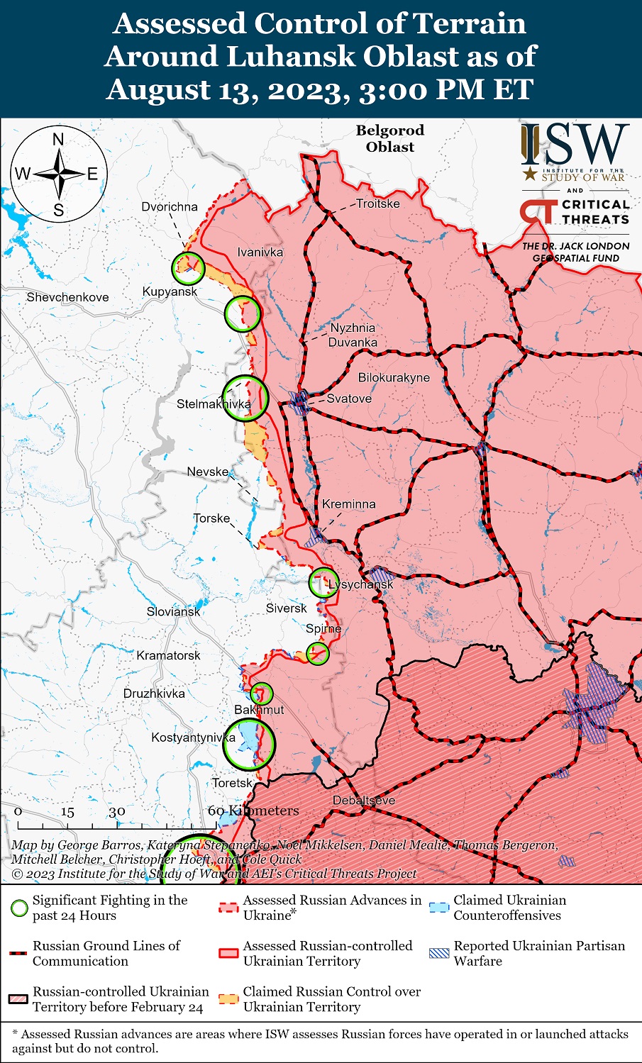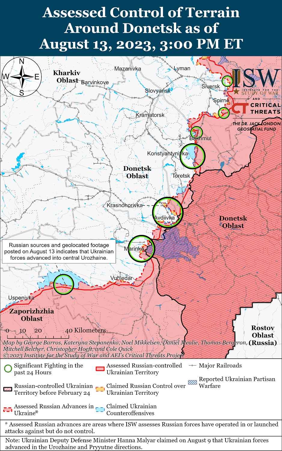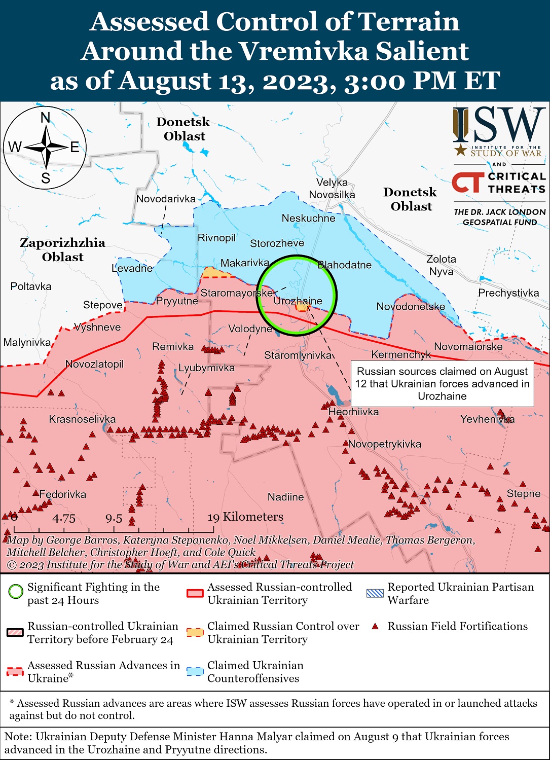 ЗСУ продовжували наступальні операції на адміністративному кордоні Донецької та Запорізької областей, і просунулися на південь від Великої Новосілки. Також українські сили атакували Урожайне (9 км на південь від Великої Новосілки) та захопили російські позиції у північній частині селища. Кадри з геолокацією, опубліковані 13 серпня, підтверджують, що деякі війська РФ залишили селище, і показують, як російська піхота відступає з Урожайного у напрямку Заповітного Бажання (менше ніж 3 км на південь від Урожайного). Українські війська також атакували Приютне (16 км на південний захід від Великої Новосілки).