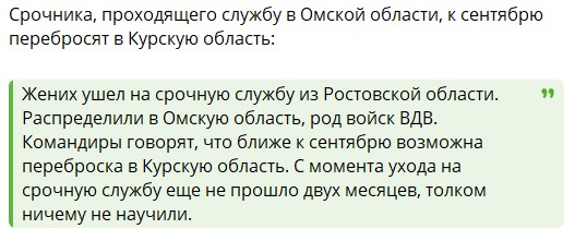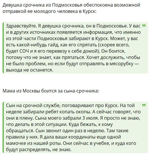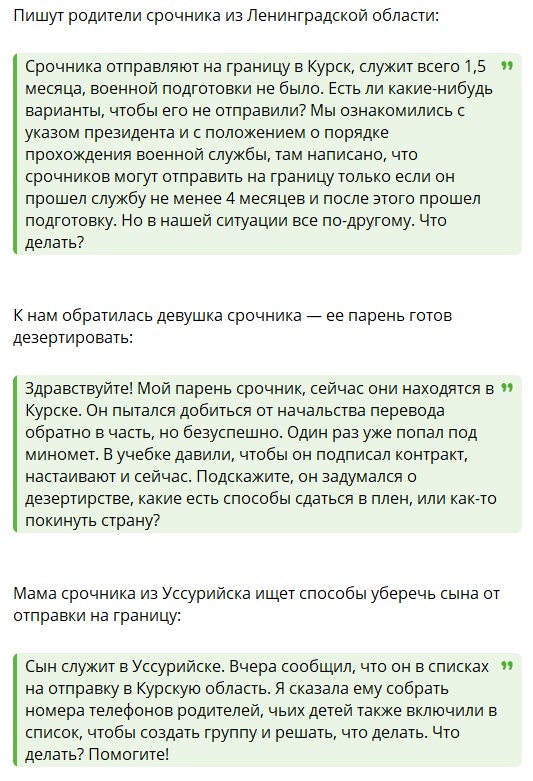 З початку курської операції проект зафіксував понад 150 повідомлень від строковиків, яким повідомили про швидке відправлення до прикордонних регіонів. Ці повідомлення надійшли із 20 регіонів Росії. 250 людей вже відправили під Курськ із Ленінградської області. Місцеперебування та завдання цих солдатів поки невідомі, оскільки вони не виходять на зв'язок.