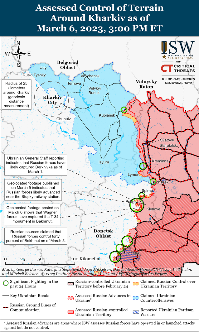 Своєю чергою, експерти ISW прокоментували заяви Володимира Зеленського 6 березня про направлення підкріплення до Бахмута та акцентували на єдності думок українських генералів Валерія Залужного та Олександра Сирського щодо продовження оборони територій Бахмутського спрямування. Радник президента України Михайло Подоляк також зазначив 6 березня, що українська оборона Бахмута досягла своєї мети і є значним стратегічним успіхом.