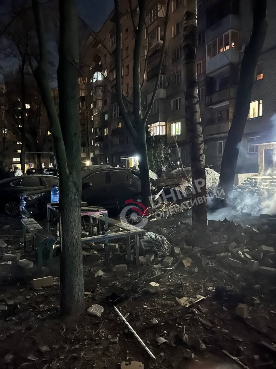 "Чергова ніч жаху, влаштована окупантами мирним мешканцям Дніпра. У потрощеній багатоповерхівці рятувальники розбирають завали. Там досі шукають людей".
