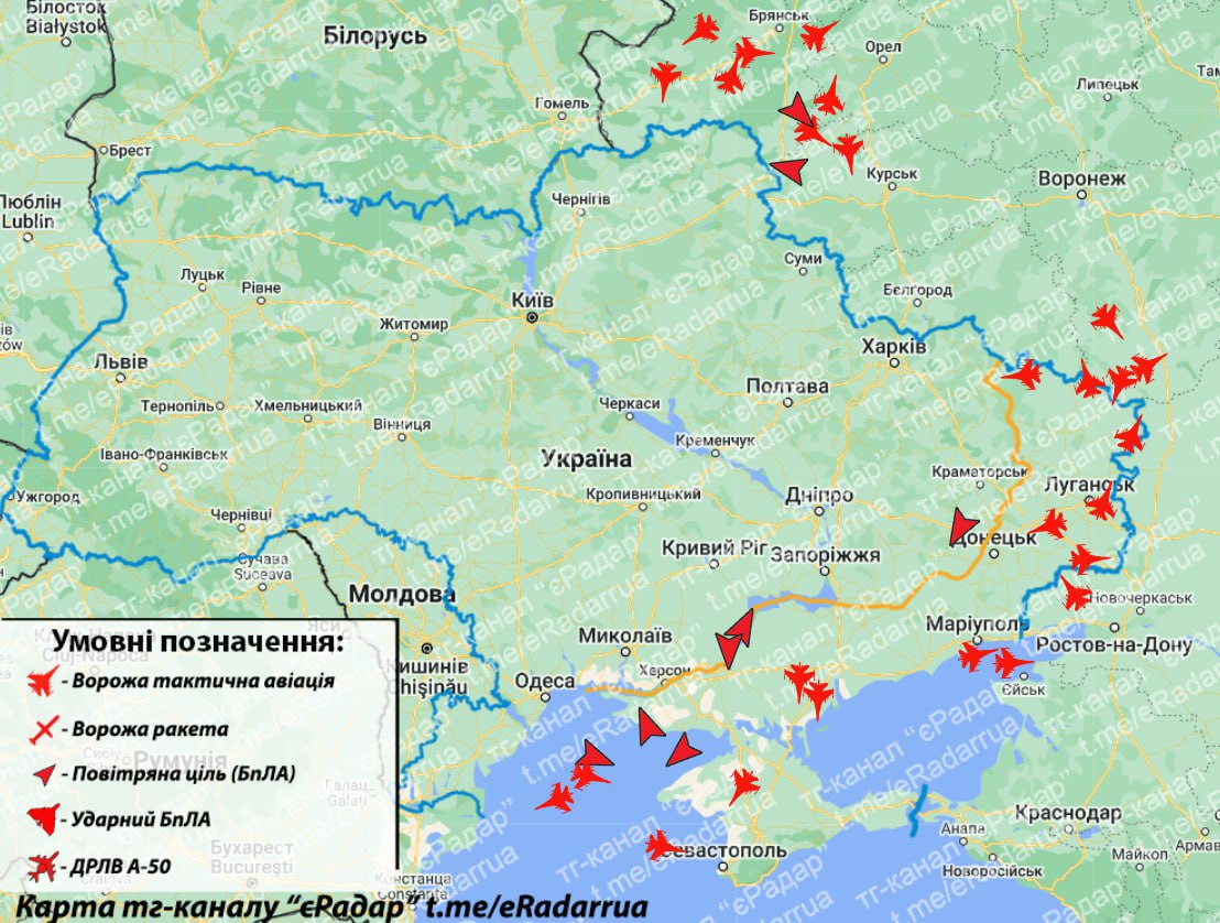 За даними моніторингової групи "monitoring", російські окупанти підняли три борти тактичної авіації ЗС РФ у акваторії Чорного моря, чотири - над Брянською областю, два - над Курською та чотири - над Воронезькою областю.