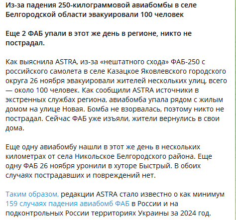Це сталося 26 листопада, коли три авіабомби ФАБ-250 були втрачені російською авіацією і впали у Бєлгородській області.