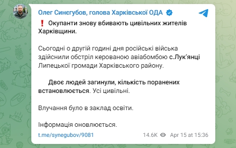 "Окупанти знову вбивають цивільних жителів Харківщини. Сьогодні о другій годині дня російські війська здійснили обстріл керованою авіабомбою с.Лук"янці Липецької громади Харківського району. Двоє людей загинули, кількість поранених встановлюється. Усі цивільні. Влучання було в заклад освіти. Інформація оновлюється", - написав. Синєгубов.