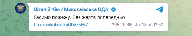 "Про результати роботи сил ППО розкажуть військові. Щодо Миколаєва - на одному з об'єктів виникла пожежа. Досить серйозна. На місці працюють рятувальники ДСНС. Вранці надамо повну інформацію", - написав Сенкевич.