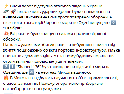 Згодом в ОК "Південь" розкрили деталі нічної атаки окупантів: росіяни атакували Одесу шістьма ракетами "Калібр", всі їх було збито. В той же час уламками збитих ракет та вибуховою хвилею від збиття пошкоджено об'єкти портової інфраструктури, кілька приватних домоволодінь. У власному будинку поранення отримав літній чоловік, його госпіталізували до лікарні.
