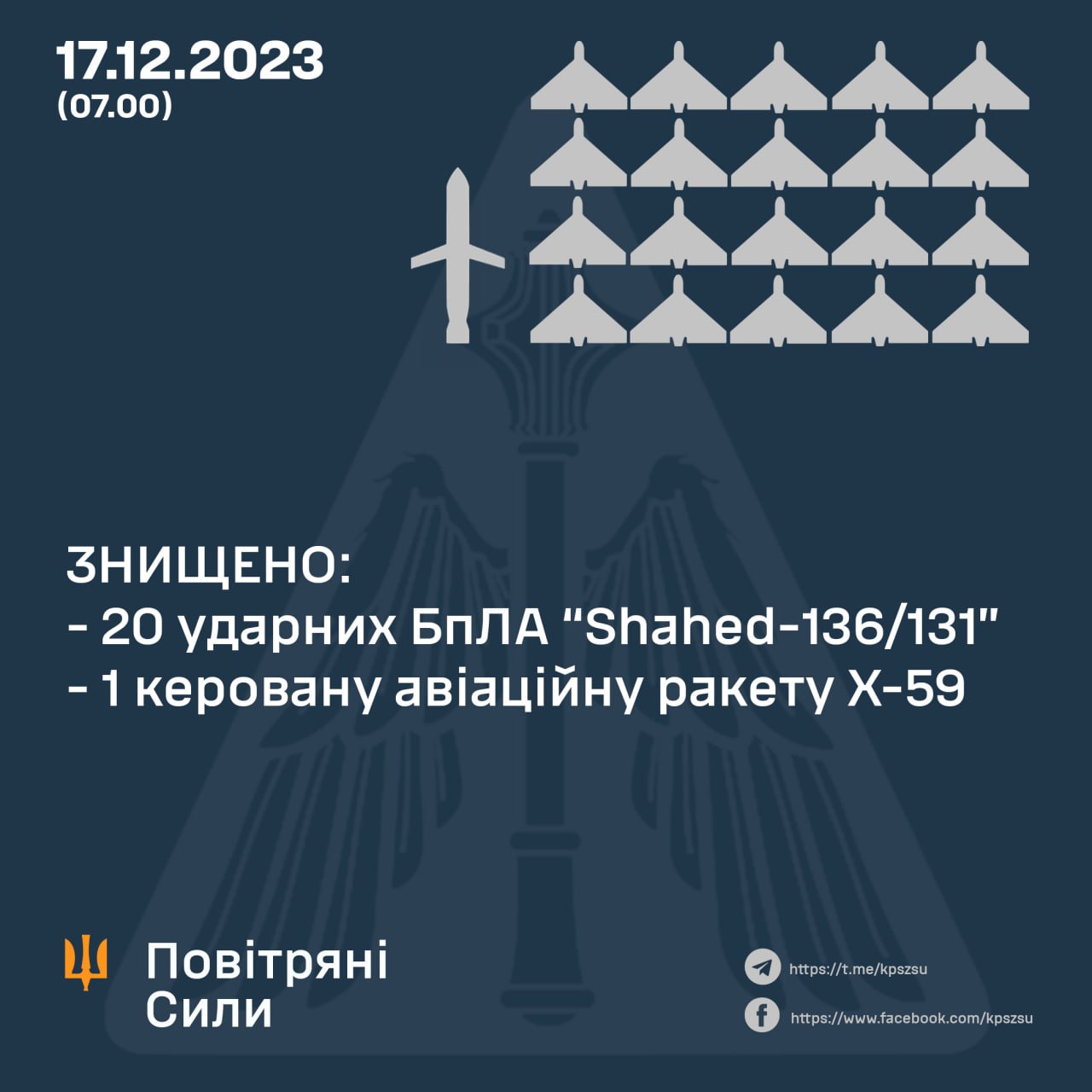РФ влаштувала у неділю, 17 грудня вночі, чергову масовану атаку на Україну. Повітряна тривага оголошувалася у Кіровоградській, Дніпропетровській, Запорізькій, Київській, Полтавській, Черкаській, Харківській, Сумській та Чернігівській областях. Влучання зафіксоване в Одеській області.