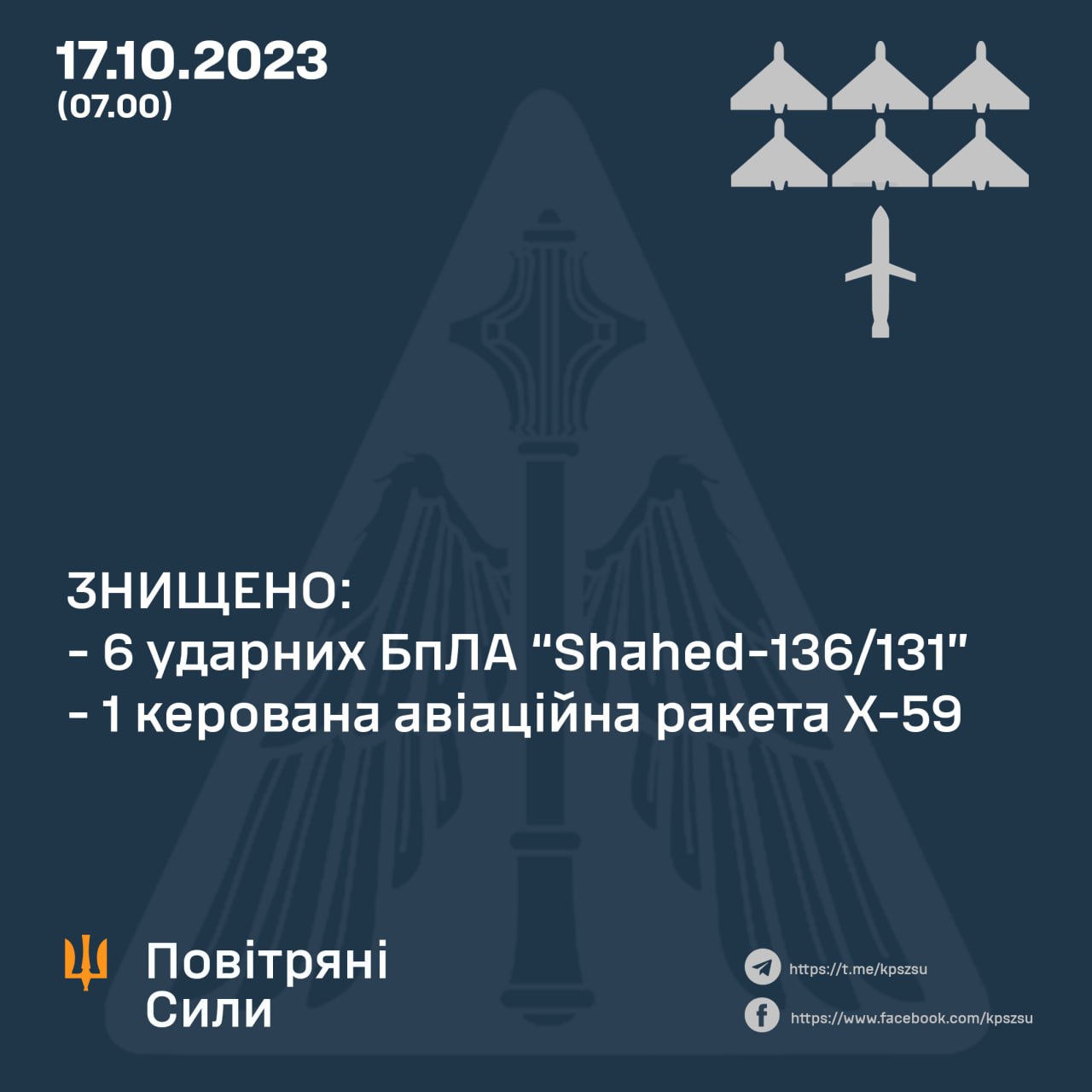 Усі сім цілей було знищено протиповітряною обороною Повітряних Сил та ППО інших складових Сил оборони України на південному напрямку.
