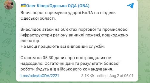 "В результаті атаки на об'єктах портової та промислової інфраструктури регіону виникли пожежі, пошкоджено елеватор. На місці працюють усі відповідні служби. Станом на 05.30 даних про постраждалих не надходило. Остаточні дані та результати бойової роботи будуть від військового командування", - написав Кіпер.