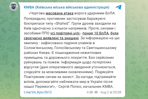 "Чергова масована атака ворога ударними БПЛА. Попередньо, супротивник застосував боєприпаси типу Shahed. інформації на цю хвилину, зафіксовано падіння уламків у Солом'янському, Голосіївському та Святошинському районах Києва. Є пошкодження нежитлових приміщень та дорожнього покриття. Без серйозних руйнувань та пожеж. Інформація про постраждалих відсутня", - йдеться у повідомленні Київської ГВА.