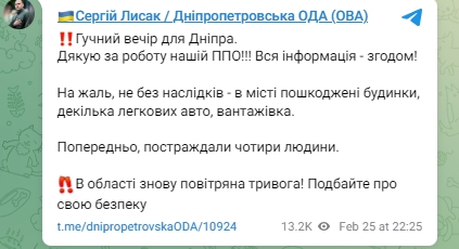 "Гучний вечір для Дніпра. Дякуємо за роботу нашої ППО!!! Вся інформація - пізніше! На жаль, не без наслідків - в місті пошкоджені будинки, кілька легкових авто, вантажівка. Попередньо, постраждали чотири людини. В області знову повітряна тривога ! Подбайте! про свою безпеку", - розповів голова Дніпропетровської ОВА Сергій Лисак.