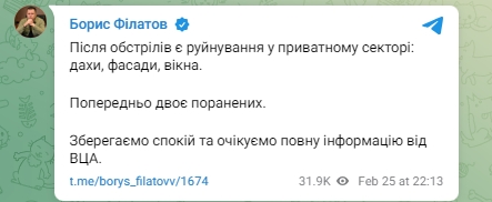 "Після обстрілів є руйнування у приватному секторі: дахи, фасади, вікна. Попередньо, двоє поранених. Зберігаємо спокій та очікуємо повну інформацію від ВЦА", - написав мер Дніпра Борис Філатов.