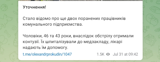 "Чоловіки, 46 та 43 роки, внаслідок обстрілу отримали контузії. Їх госпіталізували до медустанови, лікарі надають їм допомогу ", - написав Проскудін.