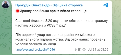 "Вранці російська армія вбила херсонця. Сьогодні близько 8.20 окупанти обстріляли центральну частину Херсона з РСЗВ "Град". Під ворожий удар потрапив працівник міського комунального підприємства. Від отриманих поранень чоловік загинув на місці", - зазначив Проскудін.