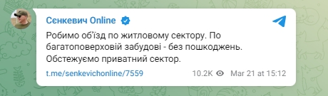 "Робимо об'їзд по житловому сектору. По багатоповерховій забудові - без пошкоджень. Обстежуємо приватний сектор", - додав Сєнкевич.
