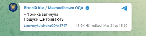 У четвер, 21 березня, росіяни вдарили балістичною ракетою по Миколаєву. Загинула одна жінка, ще 4 особи отримали травми.