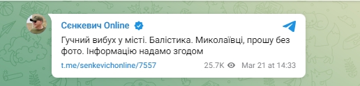"Гучний вибух у місті. Балістика. Миколаївці, прошу без фото. Інформацію надамо згодом", - написав Сєнкевич.
