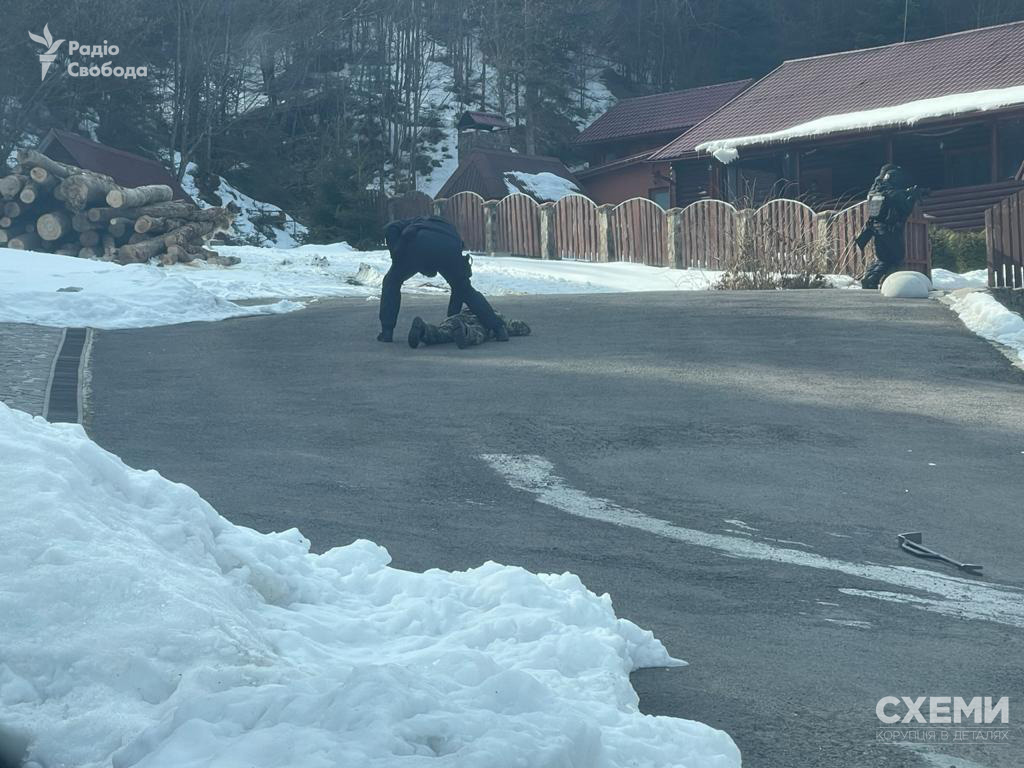 Слідчі дії відбулися в резиденції підсанкційного політика "Ведмежа діброва" поблизу Жденієво в рамках кримінального провадження, яке розслідує обласне управління Нацполіції в Закарпатській області. На фото видно працівників Департаменту стратегічних розслідувань Нацполу, які здійснювали оперативний супровід під час обшуків за участю спецпідрозділу "Корд".