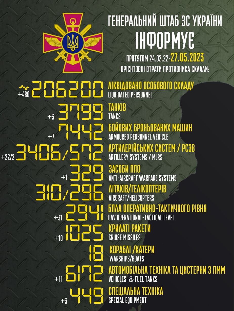 Так, загальні бойові втрати ворога з 24.02.22 по 27.05.23 орієнтовно склали: