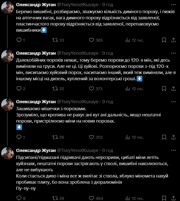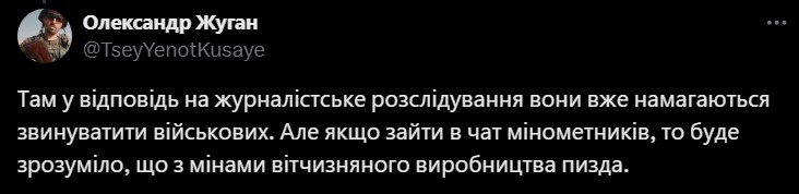 Жуган також звернув увагу, що влада намагається звинуватити у всьому військових: "Але якщо зайти в чат мінометників, то буде зрозуміло, що з мінами вітчизняного виробництва пи**а".