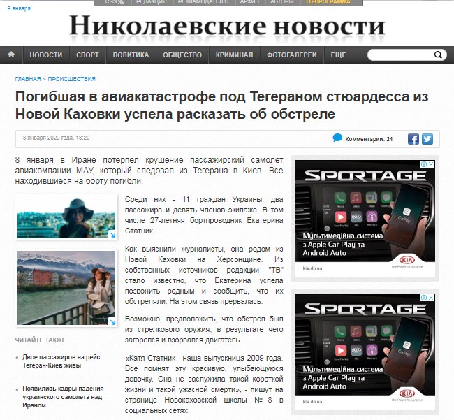 В інтернеті з'явилася інформація про те, що авіакатастрофа літака компанії "Міжнародні авіалінії України" (МАУ) в Ірані в середу, 8 січня, сталася через те, що нібито борт обстріляли.