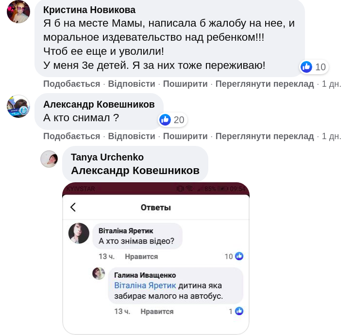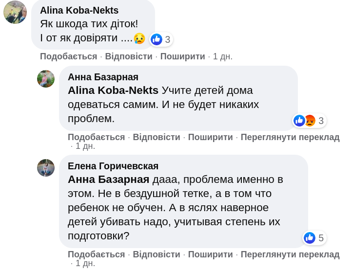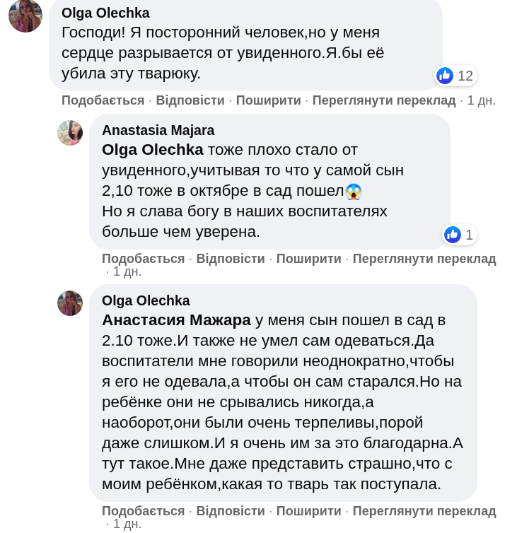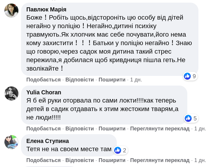 "Батьки! Це просто жах, що твориться в саду Великій Бузовій?! ... Моїй дитині 3 роки виповнилося 1 місяць тому. Він ще не може самостійно взуватися і одягатися, але такі методи "вихователя" неприпустимі! ... Такі люди не повинні працювати у дітей! Ніколи б не подумала, що доведеться таке пережити! ", - пише мати дитини.
