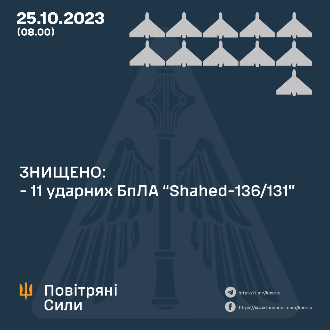 Повідомляється, що у ніч на 25 жовтня 2023 року російські окупанти атакували з південно-східного напрямку (Приморсько-Ахтарськ - рф), застосувавши 11 ударних БпЛА типу "Shahed". В результаті бойової роботи силами та засобами Повітряних Сил, у взаємодії з ППО Сил оборони України, знищено усі 11 БПЛА.