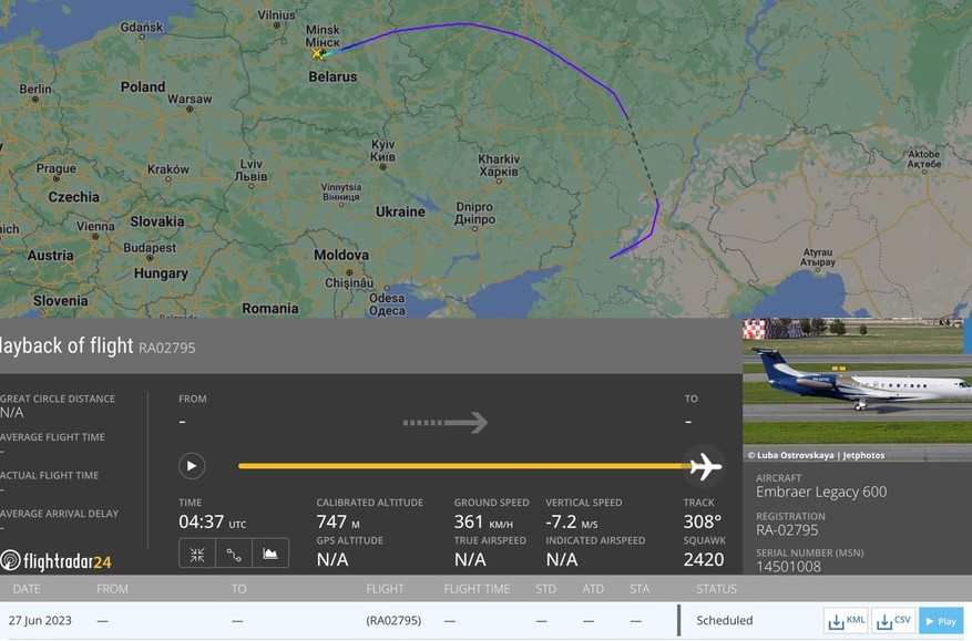 Літак із реєстраційним номером RA-02795, яким користується опальний ватажок терористичної ПВК "Вагнер" Євген Пригожин, приземлився на військовому аеродромі в Білорусі.