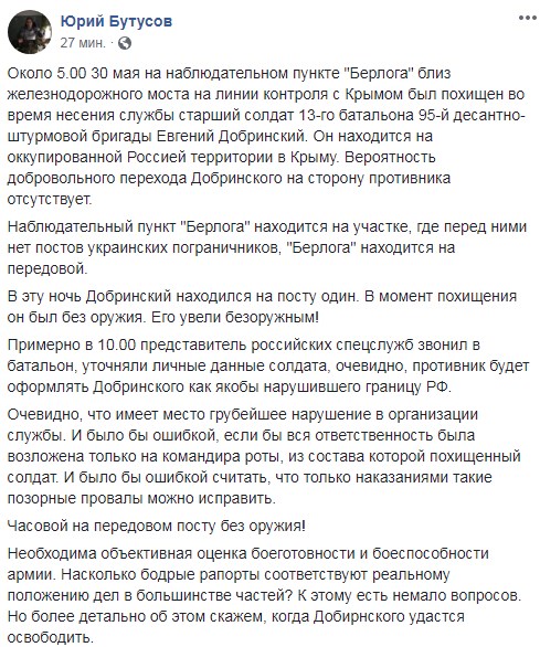 Відомо, що Добринський перебував на посту один. У момент викрадення він був без зброї.