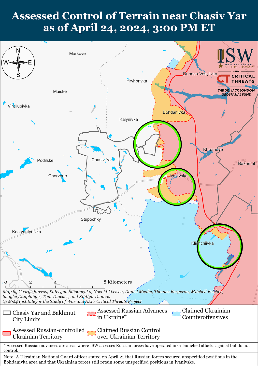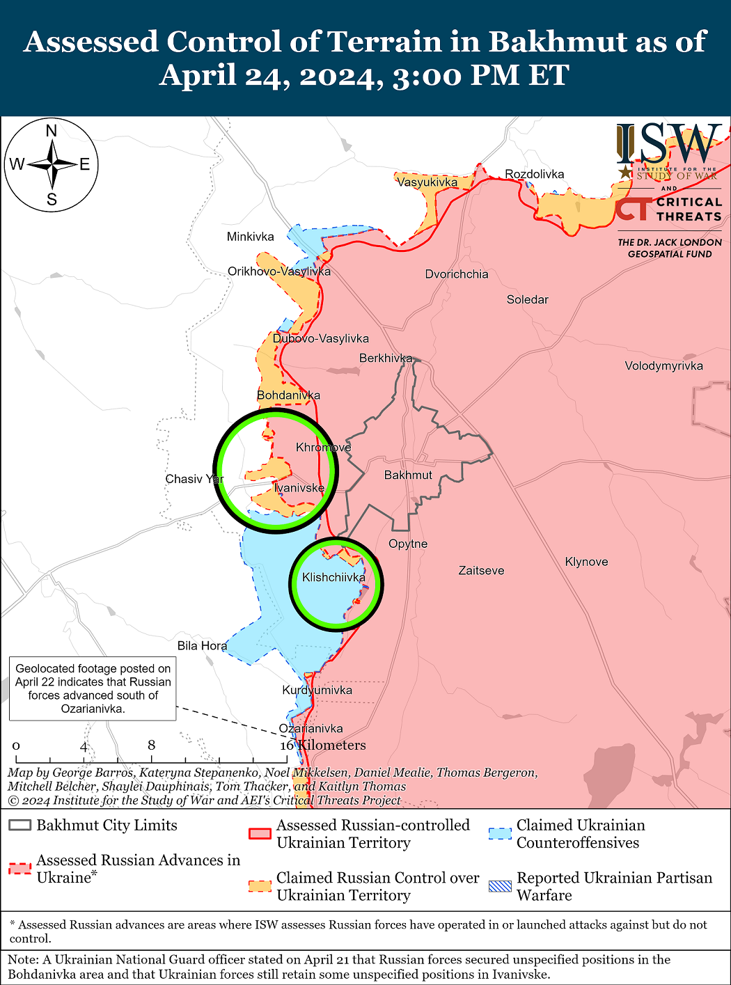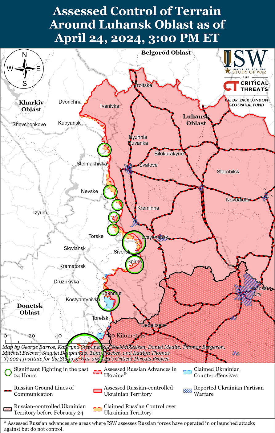 Станом на середу, 24 квітня, російські окупаційні війська продовжили наступати на Сіверському напрямку, що на північному сході від Бахмуту, але жодних змін на фронтовій лінії не відбулося.